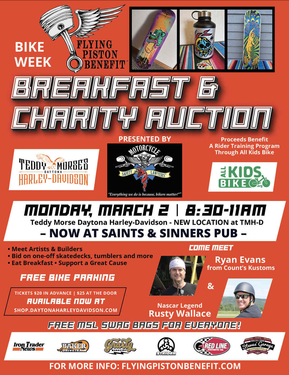 This is the 2026 Daytona Edition of the Flying Piston Benefit Breakfast and Auction presented by Motorcycle Safety Lawyers®. Come join us at our breakfast fundraiser at the Teddy Morse’s Daytona Harley-Davidson®. Our primary focus is to help kindergartners from across the United States to learn to ride on 2 wheels.